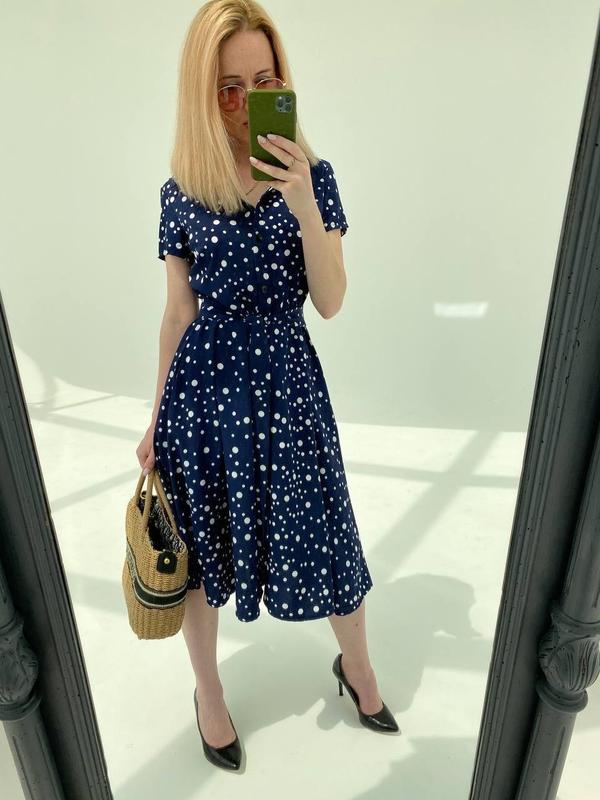 Платье в горошек Ткань турецкий софт Размеры 42-44; 46-48; 50-52 Воротник стойка Цвета чёрный , темно синий , Бордо , красный , оливка По бокам карманы Пояс тканевый идёт в комплекте Платье на пуговичках -8 пуговиц Очень хорошее качество Цена: 650 грн