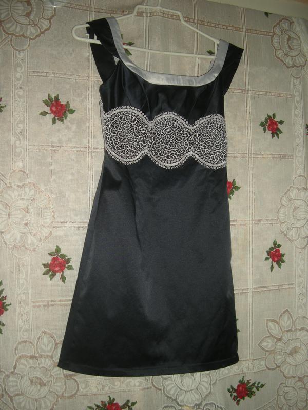 Шикарное нарядное платье красивого темно-синего цвета,застегивается сзади по центру на замок-молнию,вырез вокруг шеи обшит белой атласной лентой,впереди присобрано в складки и обшито красивыми белого цвета кружевами,немного приталенное,чудесно облегает фигуру,сзади внизу по центру разрезик,объем талии-64см.,длина-83см.