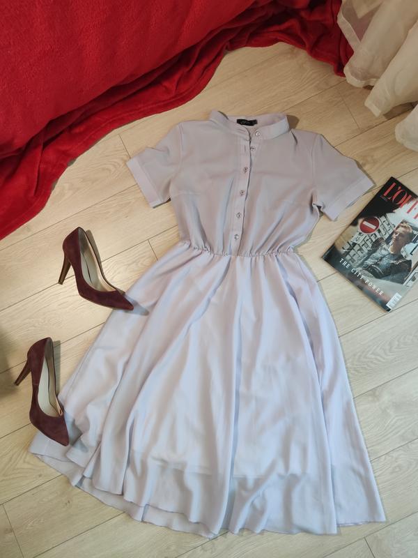 Літнє плаття світло-бузкового кольору з коміром-стієчкою. Підійде як на роботу так і на прогулянку. Гудзики робочі, пояс на резинці зсередини. Є підкладка в зоні спідниці, зверху тканина трохи просвітляється. Видно сліди носки, є затяжки! НОП 40 НОГ 50 НОТ 32 (тягнеться до 48) довжина 106