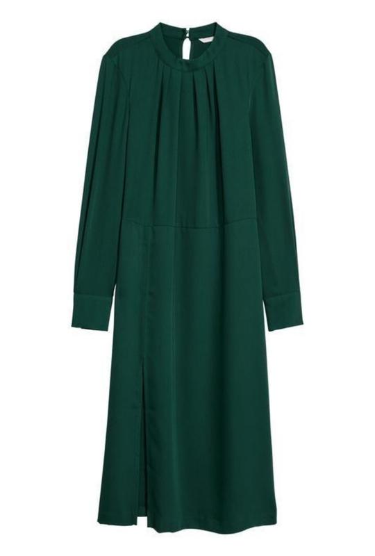 Платье миди, с разрезом спереди, цвет бутылочный, элегантное, ткань как шелк, приятное к телу, рукава на пуговичках, длина от плеча 114, ПОТ 45, ПОГ 51 под мышками Плечи 40, длина рукава 63