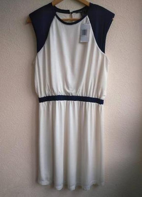 Трикотажное платье Mango. Платье на подкладке. Есть подплечники. На спине застежка в виде капли. Основной цвет ivory, пояс и плечи - темно-синие. Размер L. Подойдет по измерениям на М-L: Висота 97 см, ПОГ 55 см, ПОТ 39 см, ПОБ 60 см. Состав: 100% вискоза, подкладка 100% полиэстер.