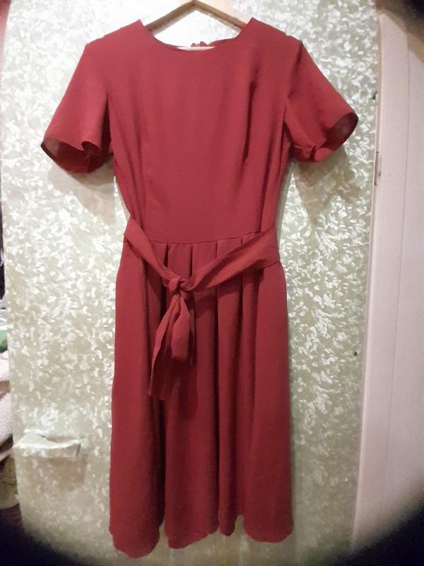 женское платье юбка в складки,по талии пояс завязывающийся.Сзади змейка до талии небольшой рукав бордово-кирпичного цвета.Длина 104,ПО талии 38см.