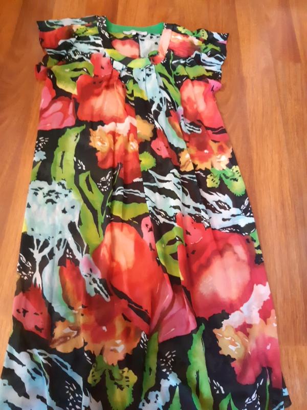 плаття, дуже гарне, яскраві кольори, вільний прямий фаворит, спереду бант. в комплекті чорна тонесегька підкладка- сарафан на бретелях, які регулюються і спинка на резинці, гарно сідає по фігурі, стан ідеальний, одягалося 3 рази. виробник Туреччина. пересилка новою або укрпочтою дешево.