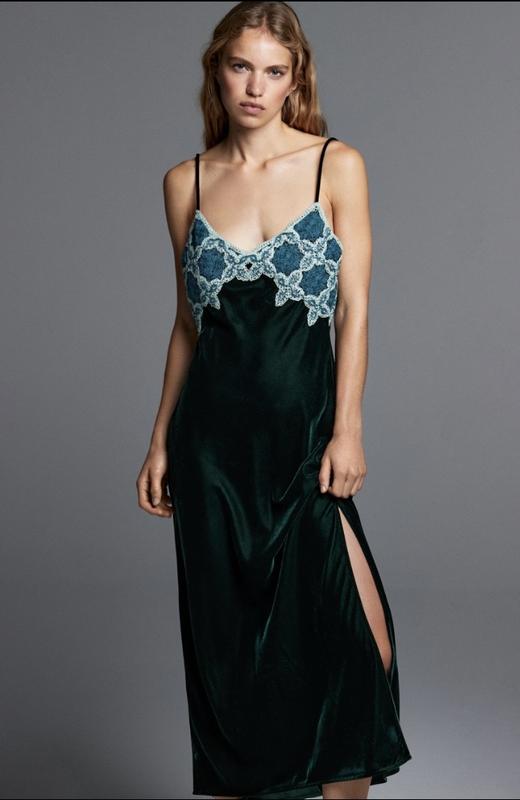 Шикарне , довге оксамитове плаття з V-подібним вирізом і тонкими бретелями. Аплікація з тканини, яка в’язана гачком. Бічний розріз. Остання колекція В наявності розмір S М ❌ Продано