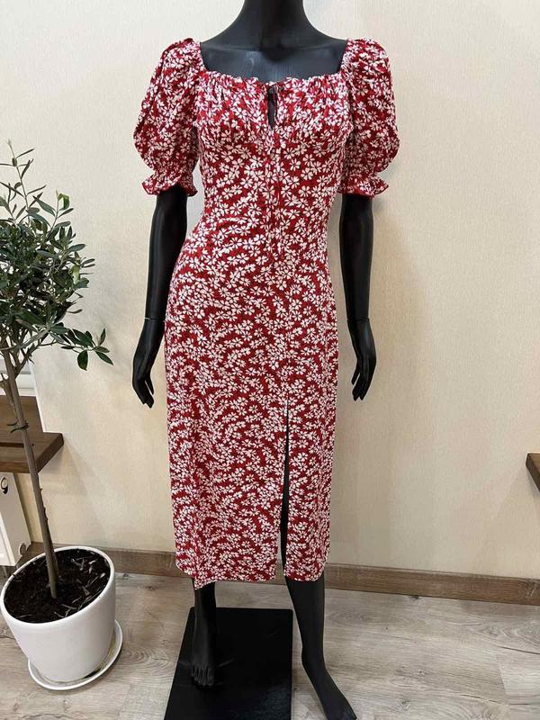 👆Сукня міді з квадратним декольте в квітковий принт. Сукня міді приталеного силуету з розрізом на ніжці. Декольте регулюється. Тканина - софт Розміри : 42, 44, 46. Країна виробник Україна 🇺🇦