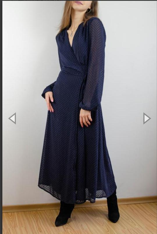 легка сукня, темно-синього кольору на запах. розмір 36, заміри: плечi 34 довжина 120 см рукав 62 см пiд руками 45 нот 35 стегна -вiльно всi замiри можно корегувати, так як сукня на запах