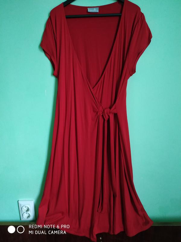 Чудова фірмова сукня з трикотажу, легенька,приємна до тіла,без застібок,на -запах.Одна половина вшита,ніби маєчкою,друга-накриває навхрест і зав'язується збоку,рукав з двох половинок,ніби пелюстки(показала на фото).Розмір вказано 16.Стан ідеал.По замірах по спинці:пог 48-55,пот 46-52, поб 50-56(обхвати потягнуться і більше,але треба враховувати, що сукня на-запах),плечі 42,рукав 10, довжина 105.Повернення немає, пишіть, питайте, відповідаю швидко.