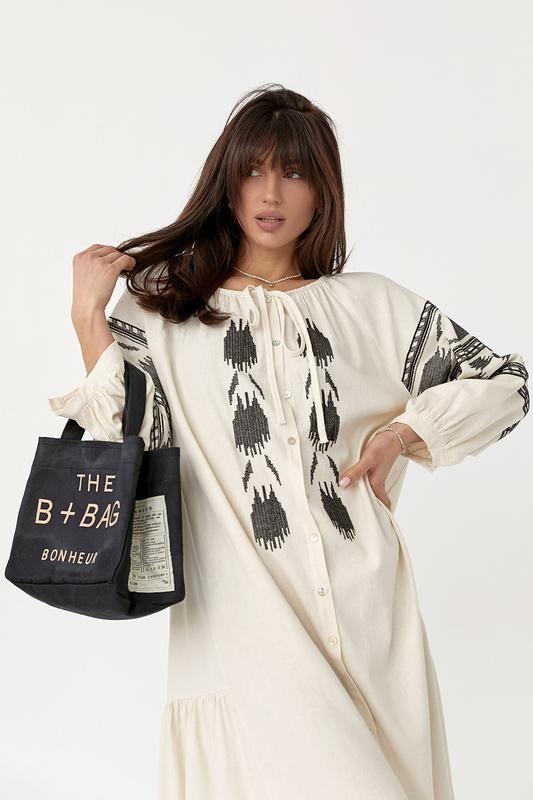 Жіноча сукня вишиванка вільного крою. Модель виконана з натуральної тканини - льону з додаванням бавовни - за рахунок якого сукня дуже м'яка і комфортна в носінні. Пишні довгі рукави внизу зібрані на широкі манжети без застібок та прикрашені гарною вишивкою. Передня частина теж оздоблена вишивкою, кругла горловина з окантовкою на зав'язках. Внизу з обох боків прилаштованість, яка додає сукні повітряного та легкого силуету. Застібається сукня на гудзики. Мастхев💙💛 🌱колір: - молочний/синій, - молочний/зелений - молочний/чорний - молочний/коричневий 🌱розмір: S | M | L Вимірювання уточнюйте 🌱склад: 65% віскоза, 35% бавовна 🌱матеріал: льон