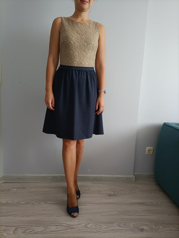 Ніжний кружевний верх і темно- синій низ, гарне поєднання кольорів. розмір м-ка(38р.). фірма yessica довжина сукні 95см( беж: 40см, 55см низ) у грудях 43см. ( тягнеться матеріал)