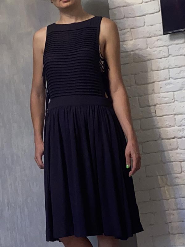 Платье миди , оригинальное шифоновое платье миди, сукня міді H&M, S. Темно-темно синій колір, майже чорний. Ідеальний стан. Дуже оригінальна модель - по бокам завязочки , спідниця а-ля пліссе. Довжина 104см, у грудях півобєм 44-46см, півобєм талії 40см.