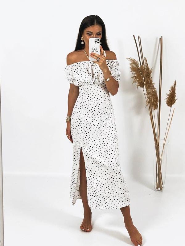 Жіноче плаття міді арт. sat. 5234 Неймовірно красиве квіткове плаття Матеріал: ніжний, легкий і приємний турецький прінтованний софт Розмірний ряд: S, M, L, XL Кольори: темно-синій квітка, чорний квітка, блакитний горох, чорний горох, бузкову Сукню довжини міді, облягаючого крою, спереду невеликий розріз, відкриті плечі на резинці, рукава на гумці, що дає можливість регулювати його по фігурі. Ззаду на талії настрочная резиночка, за рахунок чого комфортно сяде на будь-яку фігуру. Довжина виробу в розмірі S-130 см. Відмінна якість. Ціна 680 грн
