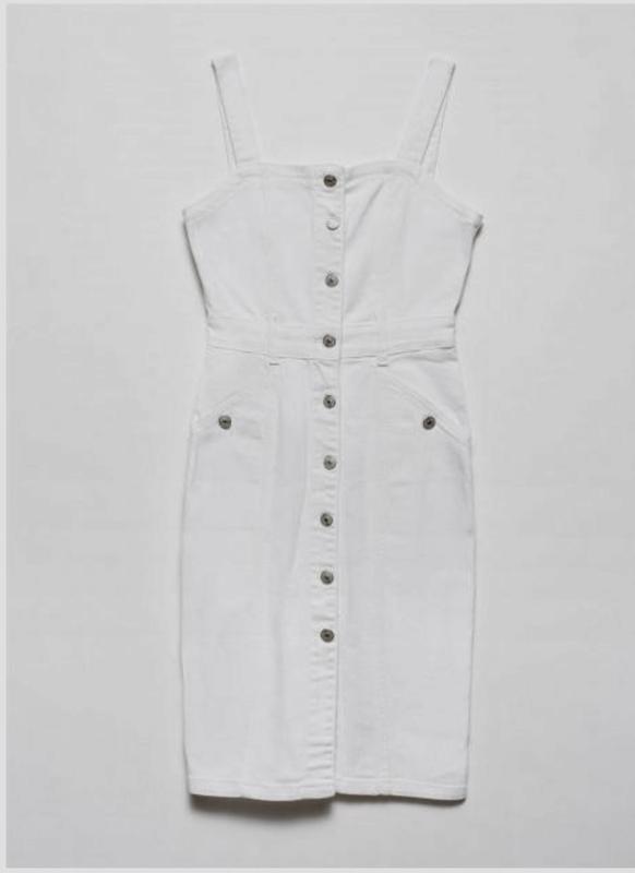 Джинсовий сарафан білого кольору з широкими брителями та читирма кишенями. Декоративні шви. Застібається на металеві гудзики спереду. Dilvin - турецький бренд.