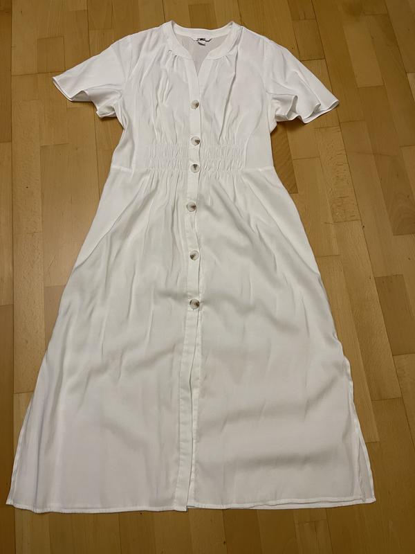 Белое платье из тонкого хлопка. Бренд Ostin. Плечи 38 см, ПОГ 53 см, ПОТ 40 см, ПОБ 62 см, длина до талии 41 см, общая длина 116 см. Дефектов нет. Ткань немного светится.