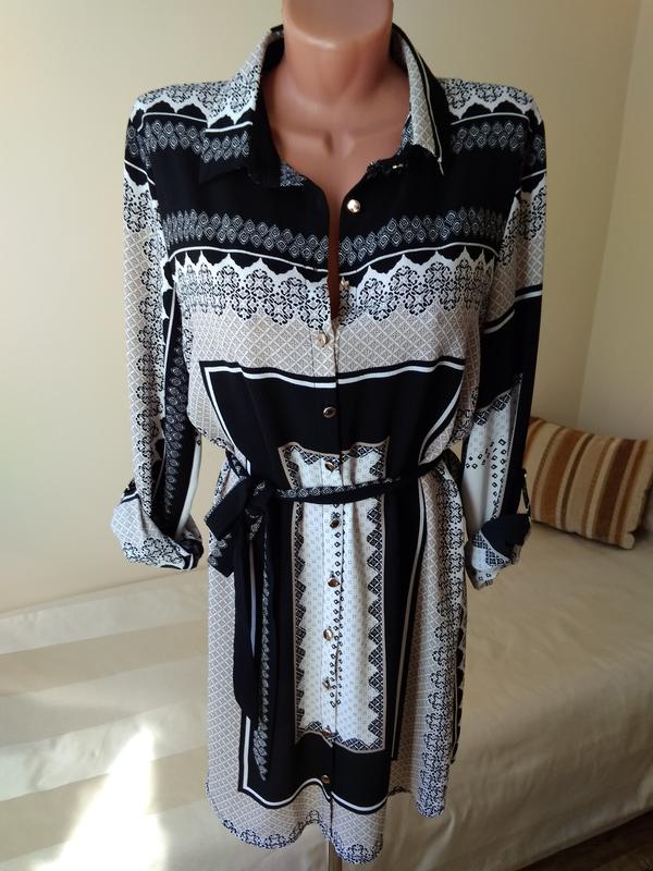 Гарна літня сукня, вказано 12 розмір, рукави на підхватах, низ півколом, з боків коротша, можна носити під поясок або без, підійде на М-Л, не велику ХЛ. Стан чудовий, єдиний нюанс, на деяких пуговицях потерлося золоте напилення від прання, за потреби можна замінити, але в цілому не кидається в очі. Додаткові фото і заміри надам за необхідності.