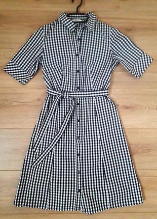 Стильна сукня в клітинку в ідеальному стані, стан нової речі. Спереду на ґудзиках, має пояс. Заміри: -довжина 93 см; -рукава 28 см; -ПОГ 42 см; -ПОТ 33 см (ззаду є невелика резинка) -ширина по нижній частині 62 см; -плечі 34 см