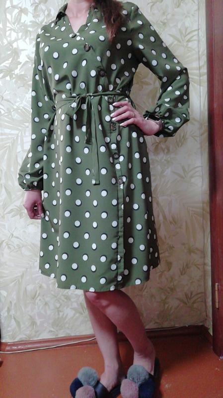Платье в горох.Очень красивый цвет.Длина по спинке 104 Длина по боковому шву 80 ПОГ 58 Длина рукава 64
