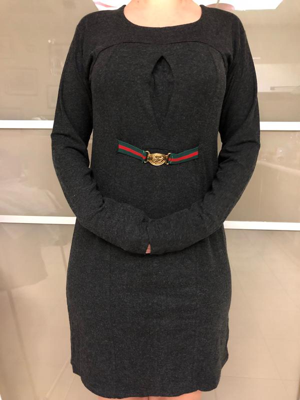 Платье темно-серого цвета с поясом по центру и металической бляхой. Платье отличного качества, приятный материал, на весну-осень. Размер указан XL, подойдет на L, по длинне 87 см., по лечам 40-44 см., обьем груди 90-100 см., талия 80-88 см., длинна рукава 62 см., бедра 96-106 см. Платье новое, с этикеткой.