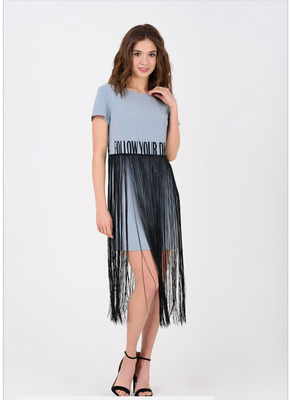 Стильна сукня вільного силуету з елементами бахроми. Дуже комфортна сукня з костюмної тканини з авторським принтом. Ефектний елемент - стильна бахрома, не тільки данина модному тренду, а й цікава деталь, що додає оригінальності. Модель дуже універсальна і відмінно поєднується з різним взуттям, як з елегантними, так і з «грубими» черевиками.
