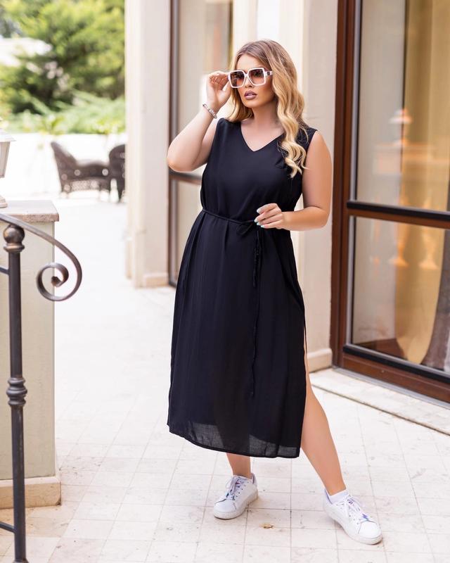 Платье Модель 1338амур Размеры42-46 48-50,52-54 Ткань натуральный хлопковый штапель. Легкое , дышащее и просто идеальное платье из натуральной ткани на лето. Лаконичный крой, длина миди и кокетливый разрез сбоку сделает это платье любимым в вашем гардеробе Платье свободного кроя, v-образный вырез спереди, тканевый поясок в комплекте Цвета: чёрный и малина Длина примерно 121/122см, разрез около 47см