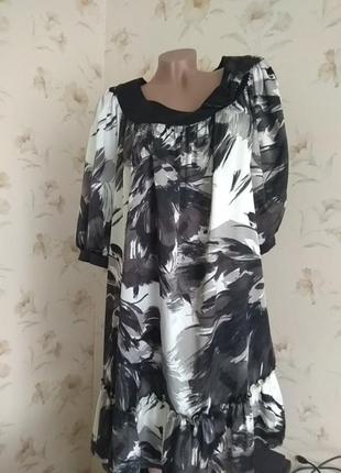 Дуже гарне плаття в чорно-білий принт. Виглядає приголомшливо. Тканина тонка, легка, якісна, з переливом, як атлас. Глибокий виріз вигідно відкриває груди. Збоку по вирізу декоративний бант. Дуже жіночно і ефектно виглядає. Рукав 3/4 - широкий, знизу на манжетике. Довжина рукава від вирізу горловини 47 см Довжина сукні 90 див. ПОГ 58см, розкльошені до низу. Знизу волан. Стан ідеальний. Сліди шкарпетки відсутні. Дефектів немає.