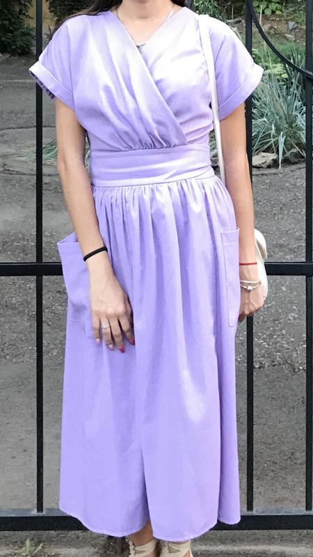 Льняное платье-халат. Идёт на запах,сзади завязывается. Имеет два кармана. Размер универсальный.