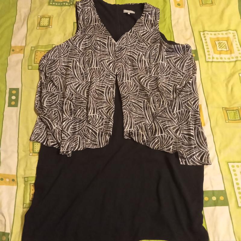 Элегантное платье,большого размера(26),скрывающее недостатки фигуры. Низ платье -чёрного цвета,а сверху идёт шифоновая накидка(черно- белая) .Состояние идеальное.Ткань не тянется. Замеры: дл.изделия:112 пог:71 поб:74