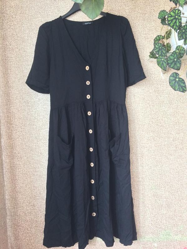Сукня з віскози чорного кольору на ґудзиках , є кишені. Заміри(см): ПОГ-46, ПОТ-45, ПОБ-69, довжина 110 см