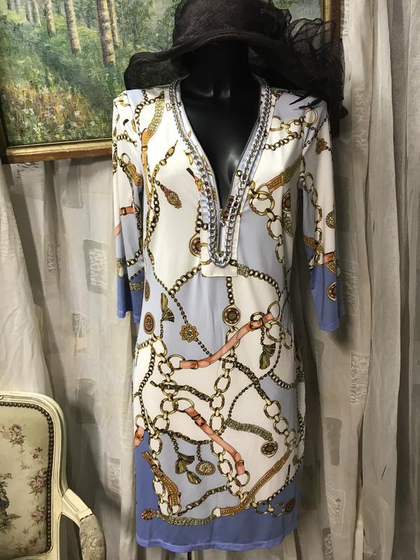 Шикарное платье от итальянского бренда K-Desind. Очень эффектное ! Полуприлегающий силуэт, шикарный декор в области декольте:цепи, тесьма, молния. Глубина декольте регулируется молнией. Вся фурнитура высочайшего качества. Платье на белой подкладке. Трикотаж, отлично садится по фигурке. Рукав-3/4. Состав:полиэстер, спандекс. Размер по бирке-М. Замеры: длина-93 см, ПОГ-45 см, ПОТ-42 см, ПОБ-49 см. Выглядит очень богато!