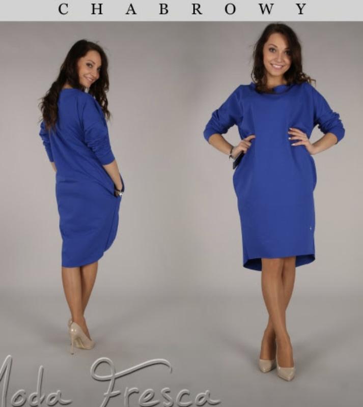 (Л/ХЛ) синій Сукня з бавовни (плотний трикотаж 95% бавовна, 5% еластан). Вільний фасон. По боках дві втоплені кишені. Розширена ззаду. Звужується до основи. Вільний фасон відмінно маскує можливі недоліки фігури. Дуже гарна якість! РЕКОМЕНДУЄМО! Універсальний розмір L/XL ширина в грудях - 2x64cm ширина в стегнах - 2x60cm ширина в нижній частині - 2x46cm довжина спереду - 92см довжина ззаду - 102см довжина рукава - 56см