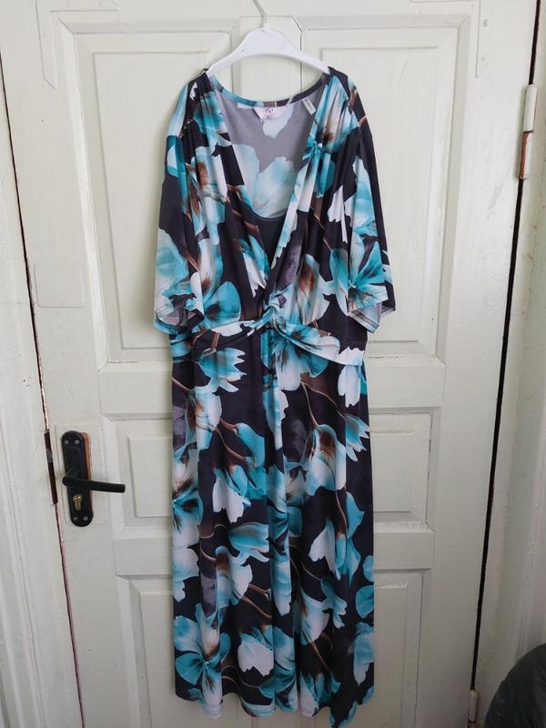 Плаття чорного кольору з квітковим принтом, V-образний виріз горловини зі вставкою, короткий рукав, верхня частина з перекрученою драпіровкою, спідниця А-образного фасону (трапеція), довжина міді, виконана зі штучного трикотажу. Квіти на фото виглядають блакитними, справжній вигляд-більше зеленого кольору.