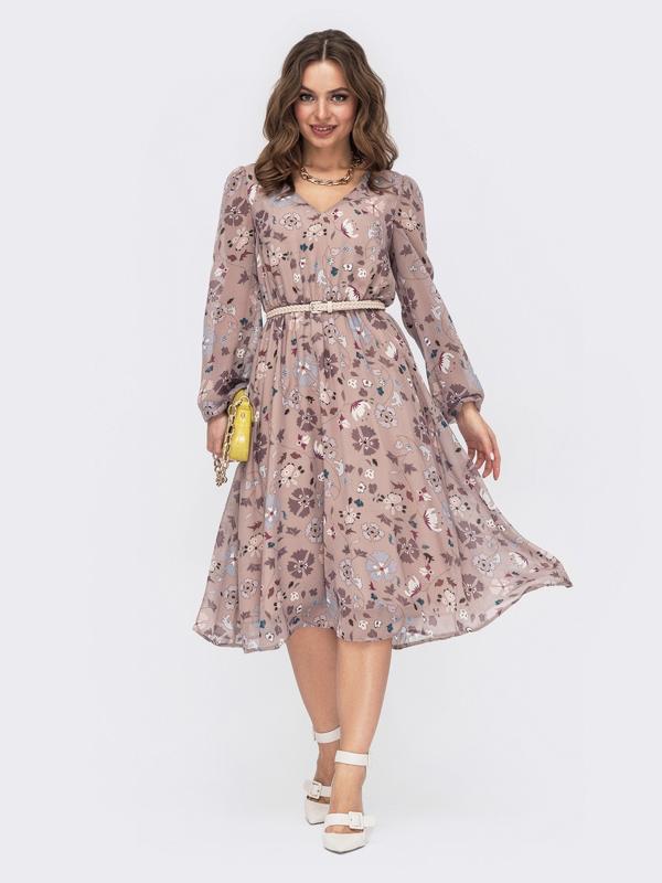 Шифонове плаття з V-подібним вирізом горловини. Модель відрізна по лінії талії з еластичною деталлю в поясі. Довгий рукав присобран на гумку по низу. Підкладка виконана з бавовни. Пояс в комплект не входить. На моделі представлений 44 розмір. довжина виробу – 111 см; довжина рукава (від плечового шва) – 63 див.