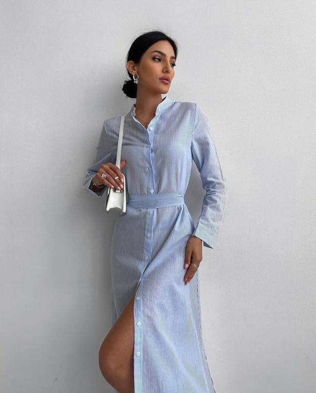 Элегантное платье арт. man. 222 Ткань: котон Цвет: в голубую полоску Размер: 42-46 (с-м) Цена: 750 грн Очень женственная модель, на талии идет поясок из основной ткани, завязываете под себя, длина меди, по бокам платья разрез, идет на пуговицах, не просвечивается