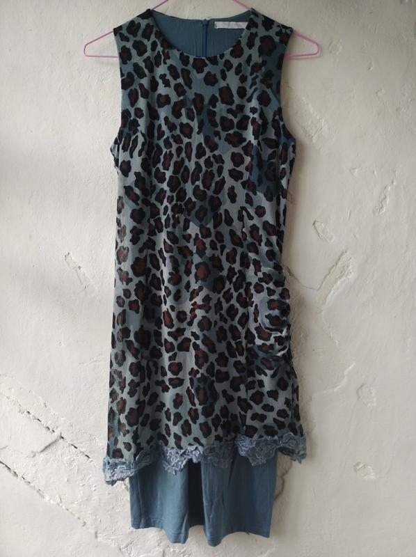 Красивое платье, без рукавов, размер XS,S. Можно в принципе и на М, но будет очень облегающим. Подкладка плотная, сверху идёт сеточка в леопардовый принт, на конце, внизу кружево. Сбоку на линии талии ткань немного собрана, длина миди, змейка сзади на спинке. Цвет морской волны, глубокий.