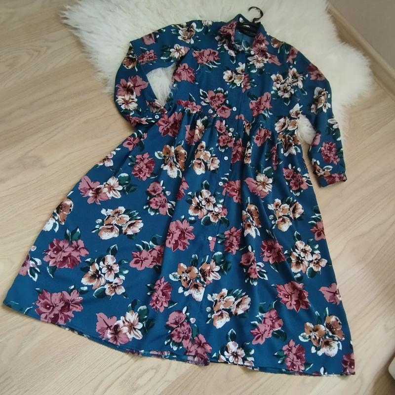 Шикарное платье в цветочный принт 38-40 в идеальном состоянии, цвет морской волны, отрезной широкий низ, свободный крой, на пуговицах, полиэстер, ткань падающая и приятная,плечи 37,:проймы 48, пот 49, длина 115