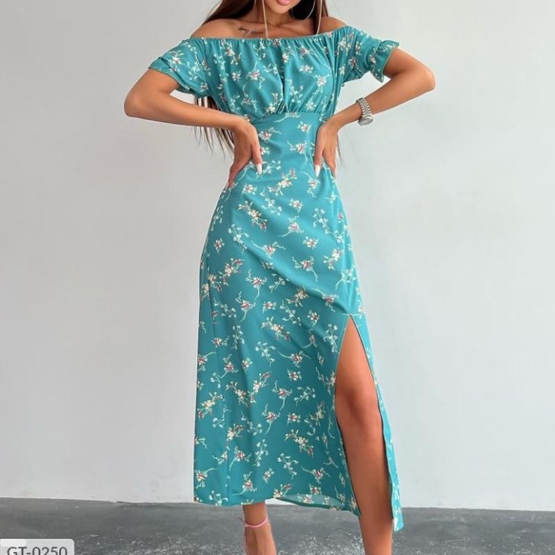 Платье GT-0276 Размеры: S, M, L, XL платье миди Материал нежный, легкий и приятный турецкий принтованный софт Цвета горошек чёрный, горошек голубой, горошек белый, горошек красный, бежевый цветок, фисташка цветок, лаванда, трава, чёрный цветок Платье длины миди , облегающего кроя, спереди небольшой разрез, открытые плечики на резинке, рукава на резиночке, что даёт возможность регулировать его по фигуре Сзади на талии настрочная резиночка, за счёт чего комфортно сядет на любую фигуру Длина изделия в размере s-130 cм