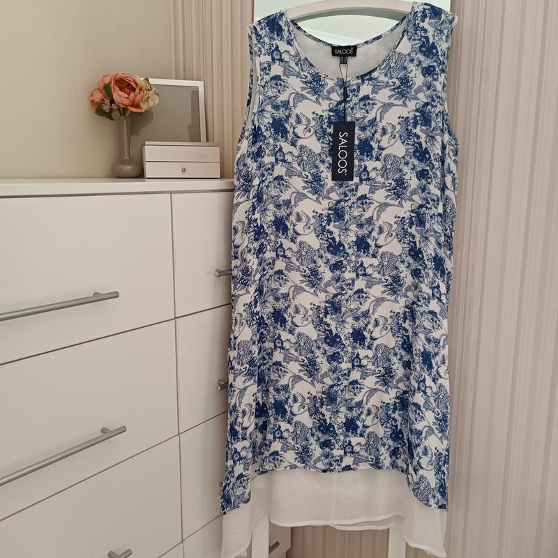Плаття нове з етикеткою, вільного крою. Біло голубе, склад 65 % ravon (штучний шовк, віскоза), 35% поліестер. Розмір 18. 📍 Довжина 110. 📍Розрізи з боків 38. 📍 ПОГ 58-59. 📍 ПОТ 61. 📍 ПОБ 63-64.