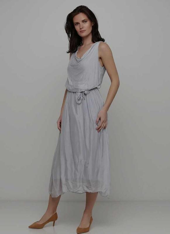 Новое длина 118см, пог 45-49см, талия на резинке + поясок. универсал грязно-голубой верх шелк, подкладка трикотаж