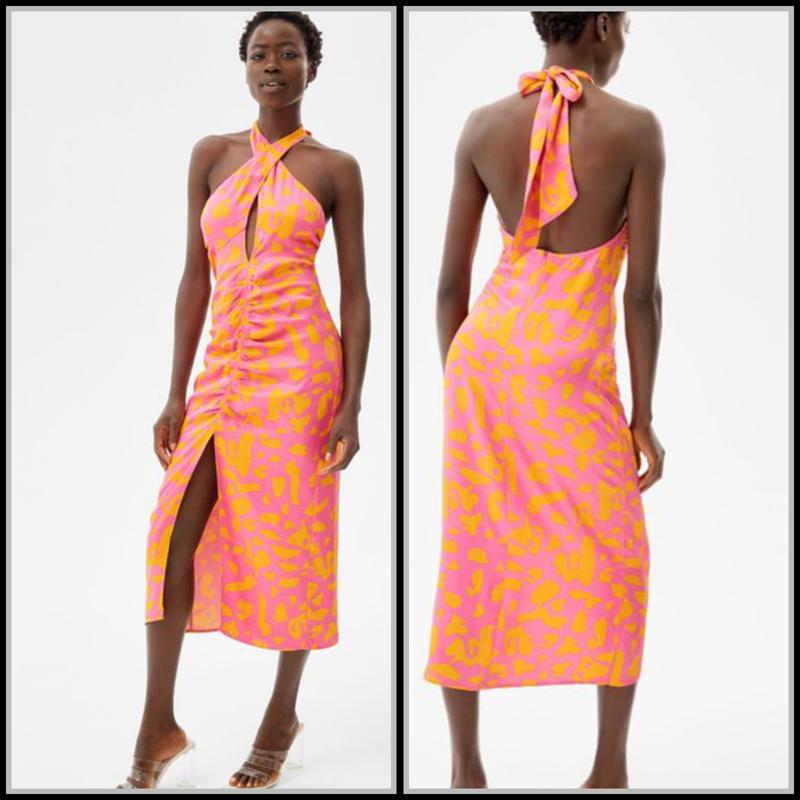 В наявності S розмір розріз спереду і збірка-гумка ззаду на спинці резиночка і блискавка тканина має красивий перелив, не тягнеться яскравий малюнок