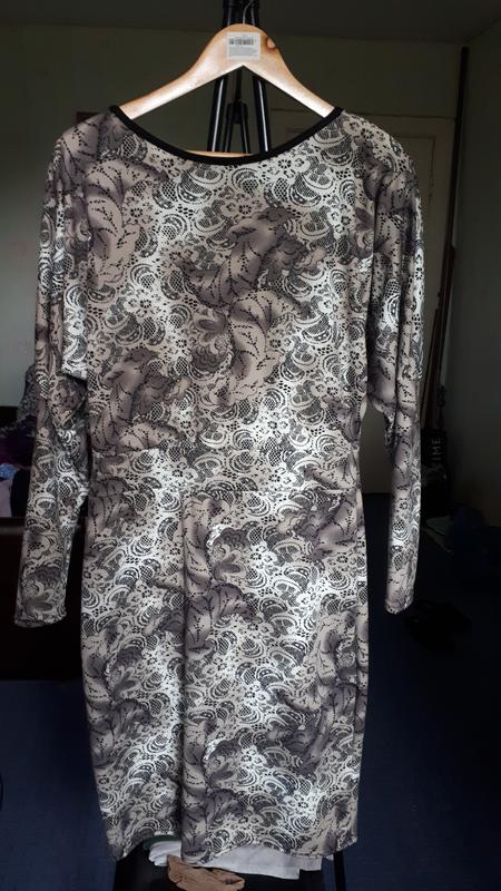 Класична сукня прямого крою. Може як замаскувати недоліки фігури так і підкреслити ії привабливість. Має цікавий принт,який нагадує мереживо. Підходить на осінь або весну. Не має плечей, тобто підійде на плечі будь які. Цікавий рукав " летюча миша". Заміри: довжина-104 пог-56( може піти і трохи більший об'єм, за рахунок пошиву рукавів. Або менші заміри, по тій же причині) пот-43( тягнеться але не сильно) низ рукава-9 поб- 50