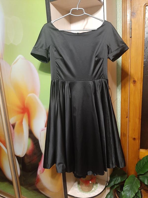 Дуже гарне плаття із цупкого атласу довжина-98 до талії-35 пог-50 пот-40 плечі трішки приспущені тканина цупка насичено чорна