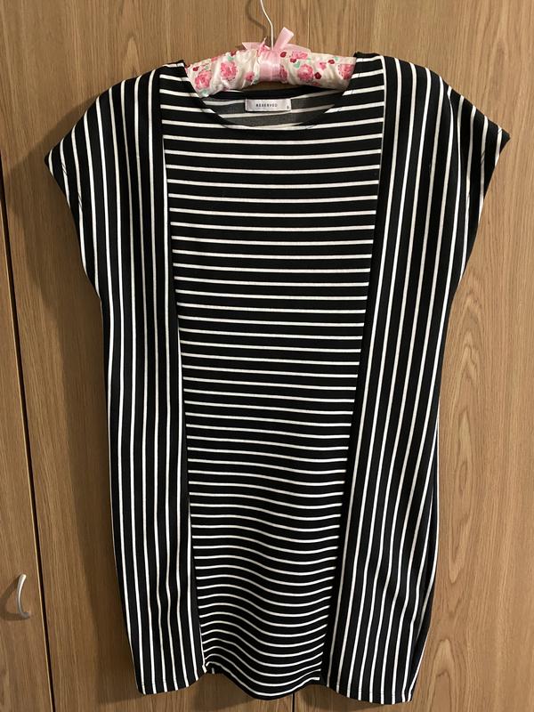 Полосатое платье (красиво подчёркивает фигуру). Длина до колена