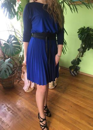 Ідеальне плаття, одягалось один раз. Колір дуже гарний, фото не передає, благородний синій з переходом в темний, з багатим відливом, без застібки, трохи тягнеться, рукав 3/4 летюча миш, підкреслює талію, приховує неідеальності фігури. Ви в ньому будете найкрасивішою.