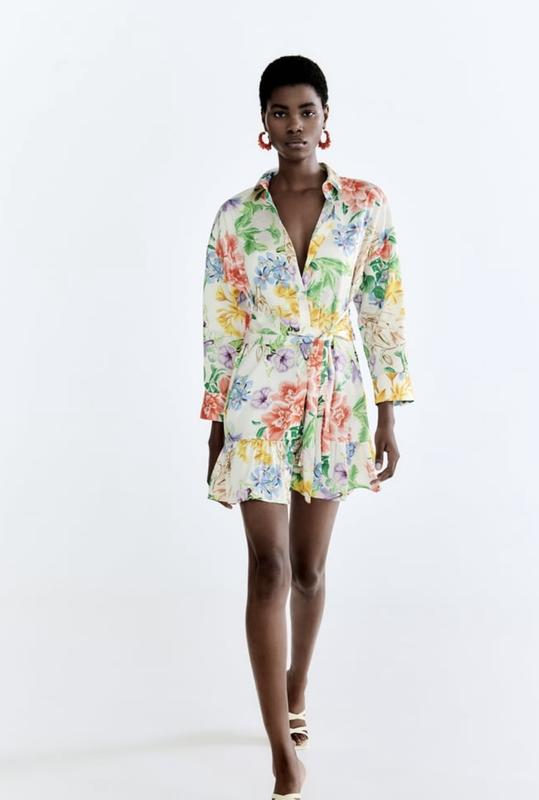 Коротка сукня з коміром і довгими рукавами з манжетами. Пов'язаний пояс з тієї ж тканини. Рюшований поділ. Спереду на ґудзиках.