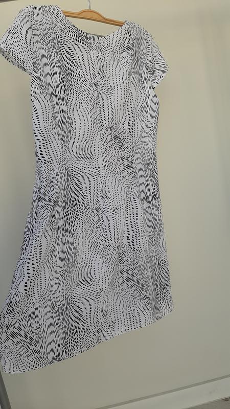 Сукня, легке, струмує. З щільного штапелю. Напівобхват по грудях 45. 5 см, напівобхват по талії 38 см, напівобхват по стегнах 49.5 див. Приталене, трапецивидное. Збоку потайна блискавка. Довжина виробу по центру переду 75 см, довжина по центру спинки 77.5 см Довжина рукава 10.5 див.