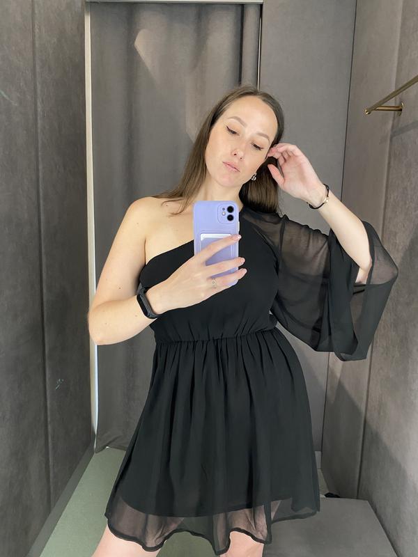 Сукня на одне плеча, коктельного типу з трикотажним підкладом. Завищена талія Розмір М-L. Довжина сукні від грудей -77 см Склад - 100% поліестер