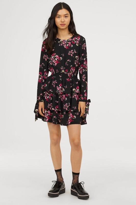 Сукня від шведського бренду H&M. На поясі резинки. Відкрита спина. Тканина м'яка, струмка, не тягнеться. Стік, без бірок. (4079) Розмір: 38 Напівобхват грудей: 47 см Напівобхват талії: 30 см, тягнеться до 55 см Довжина від плеча до талії: 40 см Ширина пройми: 26 см Ширина плечей: 41 см Довжина рукава: 60 см Довжина виробу: 83 см Склад: 97% поліестер, 3% еластан