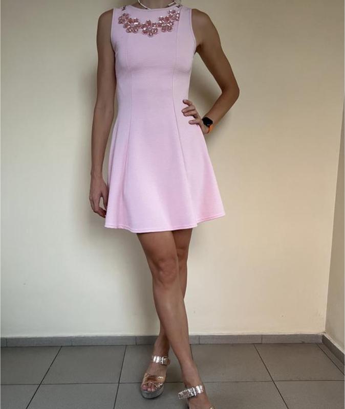 Рожеве плаття вище коліна. Буси дуже прикольні, якщо що можна відстигнути. Купувала у Великобританіі. На сукні вказаний розмір 38. Але краще на S-XS