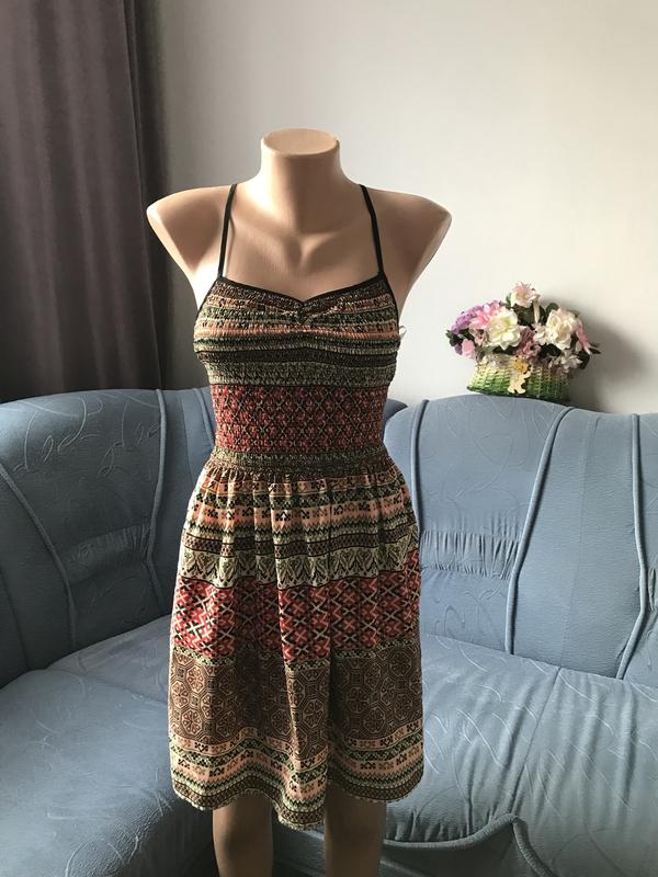 Плаття-сарафан на тонких бретелях .Тканина тонка,легка,але міцна,не мнеться.Спереду і по боках плаття до пояса регулюється, завдяки тонким резинкам,які при потребі розтягуються і приховують можливі недоліки фігури. Довжина-85 см., ПОГ-36-44 ПОТ:31-44 см., ПОБ -56 см.