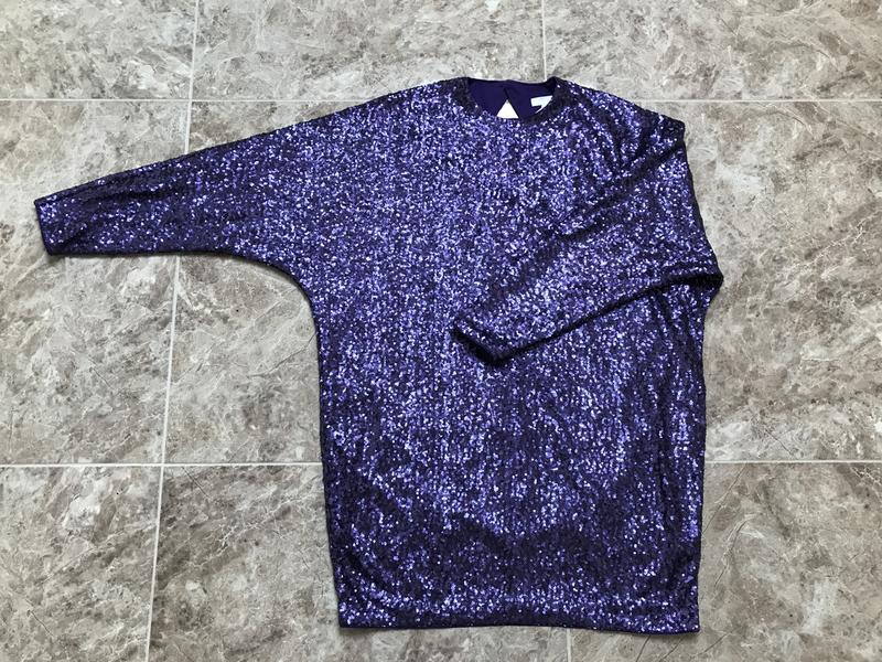Сукня фіолетового кольору, святкова, вся в паєтках. На спинці красива крапелька там де застібка. Можна підкреслити талію поясом.