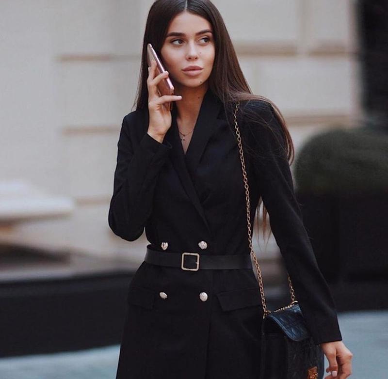 Сукня-піджак чорного кольору, розмір S, довжина по спинці 83 см, плечі - 40 см. Стан новий, не підійшла за розміром. Ремінець йде в комплекті